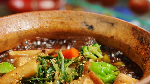 Κόβουμε τα λαχανικά σε φέτες, ρίχνουμε αλάτι, πιπέρι και λεμόνι. Σκεπάζουμε το πήλινο με το κάλυμμα του και ψήνουμε το φαγητό για 60 λεπτά στους 250 βαθμούς.
