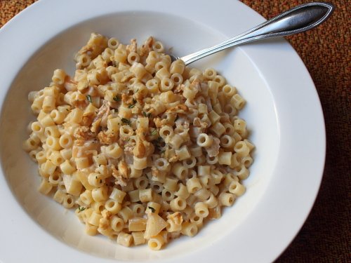 Κοπανίζουμε τα 250 γρ. καρύδια στο γουδί και προσθέτουμε το ψωμί, το σκόρδο και το αλάτι χτυπώντας συνέχεια, ώσπου να γίνουν μια λεία κρέμα. Αν το μείγμα είναι πολύ πηκτό, το αραιώνουμε με νερό. Βράζουμε τα ζυμαρικά σε αλατισμένο νερό και τα στραγγίζουμε. Σερβίρουμε τα μακαρόνια σε πιατέλα και ρίχνουμε από πάνω τη σάλτσα των καρυδιών. Σκορπίζουμε επάνω στο φαγητό τα υπόλοιπα καρύδια.