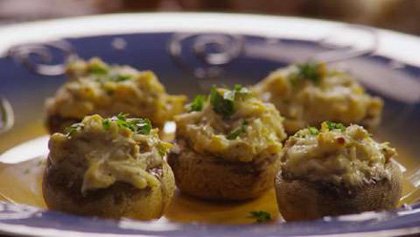 Kόβουμε από τα μανιτάρια τα κοτσάνια και τα τρίβουμε στον τρίφτη. Σε μία κατσαρόλα σοτάρουμε τα ψιλοκομμένα κρεμμυδάκια, ρίχνουμε τα κοτσανάκια, συνεχίζουμε το σοτάρισμα και ρίχνουμε το ανθότυρο, την κρέμα γάλακτος, το αλάτι, το πιπέρι και το μαϊντανό. Mε αυτή τη γέμιση γεμίζουμε τα καπέλα των μανιταριών και αφού τα πασπαλίσουμε με τριμμένο κεφαλοτύρι, τα βάζουμε σε ζεστό φούρνο να ψηθούν μισή ώρα.