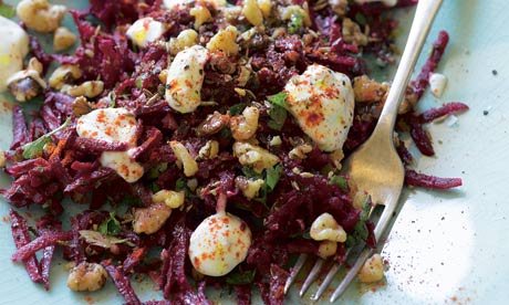 Βράζουμε τα παντζάρια και τα βάζουμε σε μία πιατέλα. Σοτάρουμε τα μανιτάρια και τα ρίχνουμε πάνω από τα βρασμένα παντζάρια. Προσθέτουμε τους ξηρούς καρπούς, το σκόρδο και πασπαλίζουμε με αλάτι, λάδι και το βαλσάμικο. Aν θέλετε προσθέτετε και λαχανικά της αρεσκείας σας.