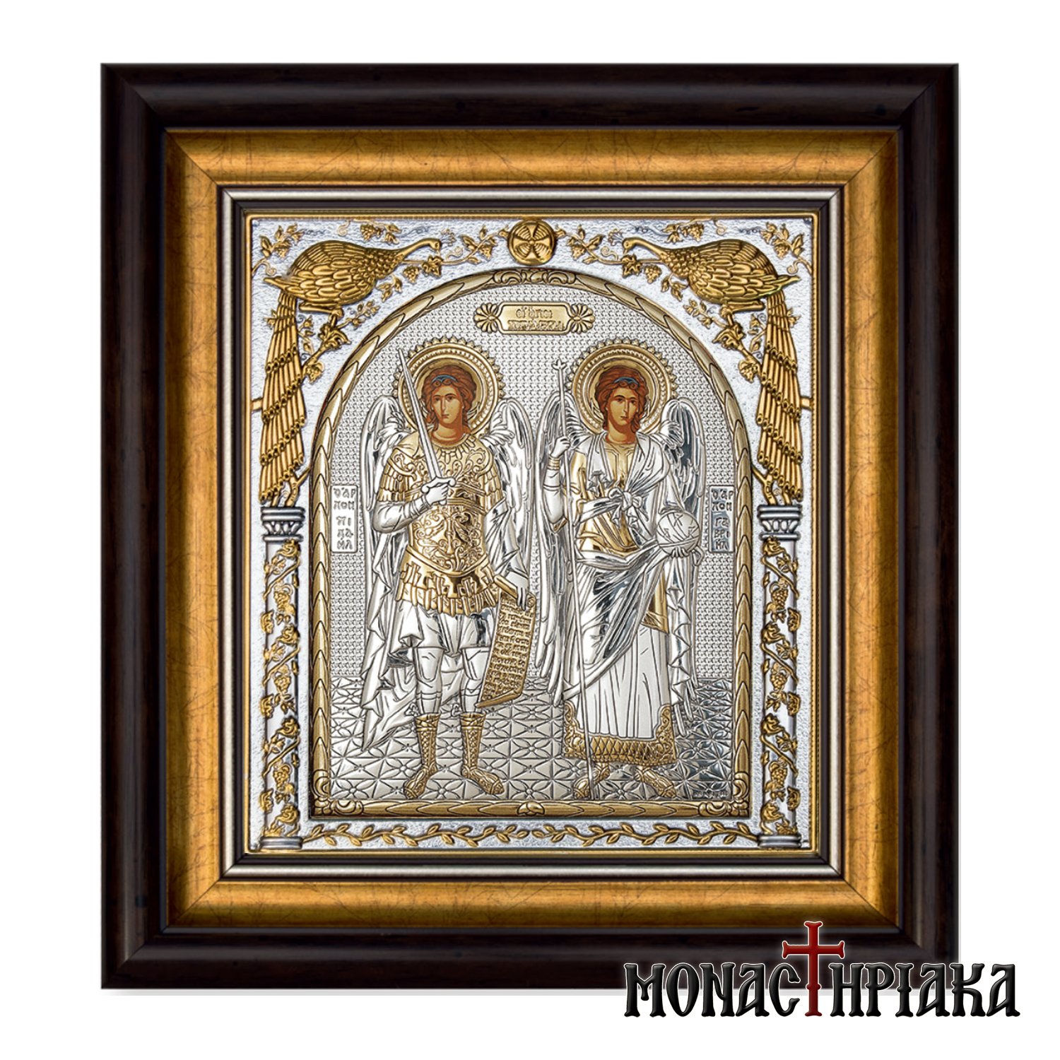 Silver-plated icon with Archangel Michael and Archangel Gabriel in a wooden frame. The icon is richly decorated with embossed Byzantine designs composed of a special, durable metal alloy, impregnated with pure silver 999. The special treatment with the PVD method, as well as the excellent quality silkscreen printing according to the standards of Byzantine iconography, create the final result of the icon that remains unchanged over time. The icons of this series can be hung on the wall with the hook they have.