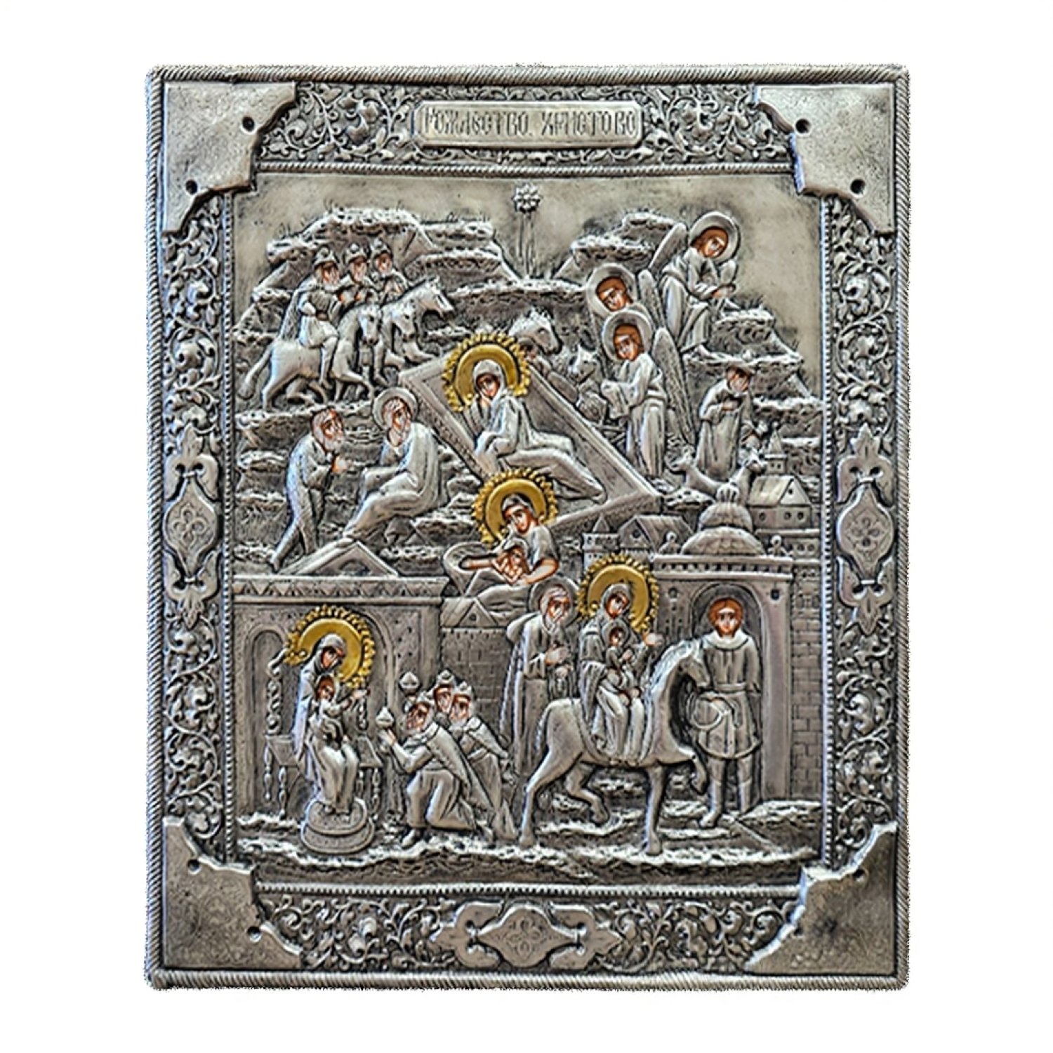 Silver icon with the Birth of Jesus, the Flight into Egypt and the Adoration of the Magi. Handmade silver icon on natural wood, made with 925ο silver. The natural wood used for the synthesis of the icon is beech (fagus) from Mount Athos, a wood that is receptive to aging techniques that give the appearance of vintage to the wood, without altering the depicted image.