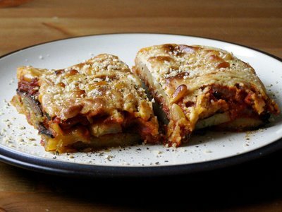Peel the potatoes and the aubergines. Wash them and cut them in slices. Then, sprinkle the aubergines in salt and let them sit for about an hour at least. After that, fry the potatoes first and then the aubergines, after you have washed and drained them. Peel the onions and the garlic and chop them. Saute them and when they brown, pour the tomatoes, which have been mashed first (in the blender). When all the ingredients are boiled for 15 minutes, pour the spices and then turn off the heat. Then, prepare the baking pan. Make a layer of potatoes and using a deep spoon, spread some of the stuffing onto the potatoes. Sprinkle some breadcrumbs and some grated yellow cheese (kefalotiri). After that put another layer of aubergines. Repeat the procedure, that is, potatoes, stuffing, breadcrumbs, yellow cheese, aubergines, stuffing, breadcrumbs, yellow cheese. The adequate amount of the ingredients is to make two layers of potatoes, two layers of aubergines and four layers of breadcrumbs, yellow cheese and stuffing.