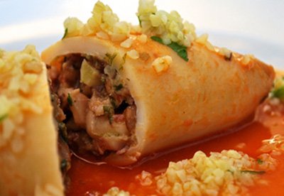 Wash and clean the squids. Remove their heads and cut in to small pieces. Put the squids in boiling water for 10 minutes just to become smoother. Put them in a colander to drain. Saute the onion and garlic with the oil of the half cup. Then, add the heads of the squids, chopped, the parsley, the dill, salt, pepper and the tomato paste (if you prefer it with tomato). After all these ingredients boil, add the rice (as much as you estimate that it takes to fill the squid, the half of it). Turn them at each side two or three times and add half a cup water. When the water is absorbed, remove from the heat and stuff the squids. You can hold the opening of the squids with a toothpick. Then, spread them in a wide pot. Drizzle the squids with the remaining oil and one cup water. Simmer, until they are left with their oil. At the end add the lemon juice, if you did not use tomato paste.