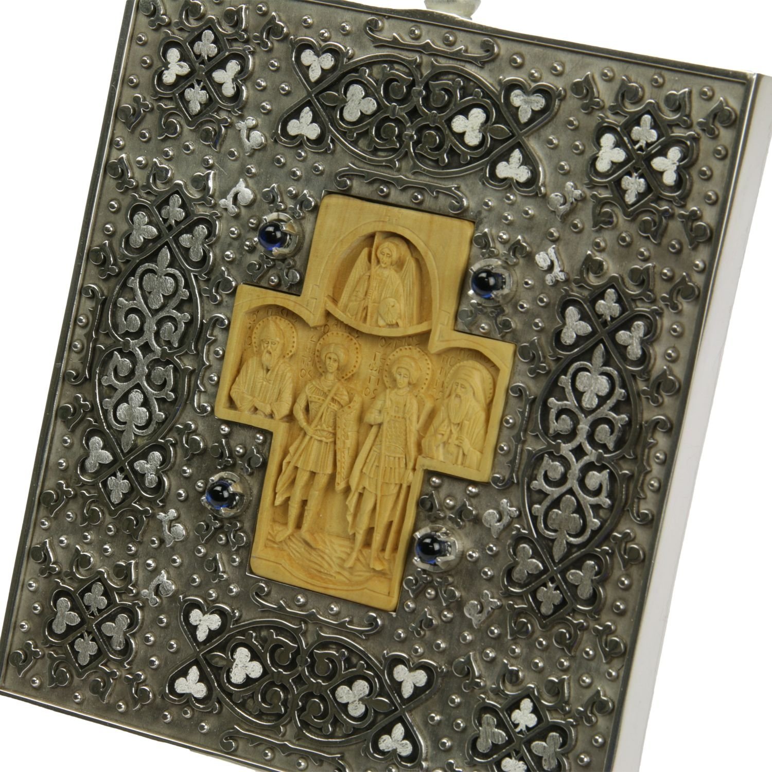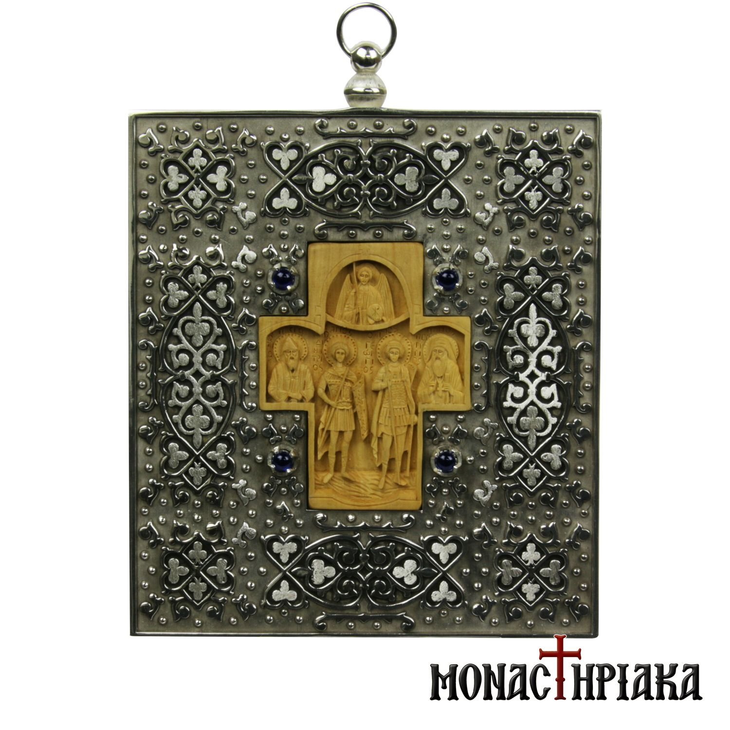 Multifaceted, handmade wood-carved cross, made of boxwood. Saint Demetrius and Saint Georgios are placed in the center of the cross, accompanied by Saint Paisios of Mount Athos and Saint Porphyrios from Kavsokalyvia. At the top, stands archangel Michael, holding his sword in his right hand.