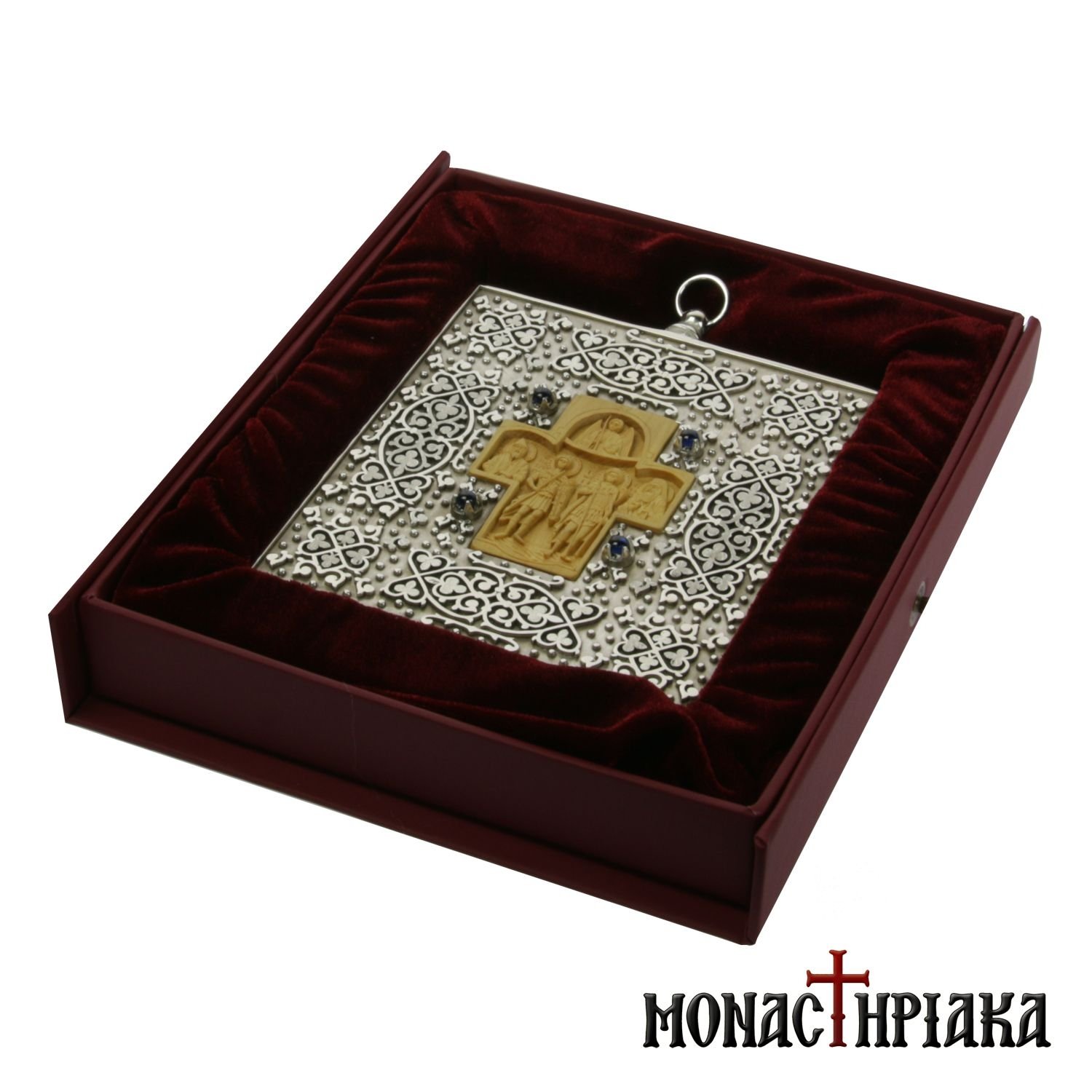 The cross is inscribed in a handmade 925o silver frame, decorated with Byzantine motifs. This composition is a unique piece of art, made by the monks in the Holy Skete of Saint Demetrius on Mount Athos, with respect to the tradition of the ecclesiastical art. The handicraft is delivered in a luxurious box with velvet coating.