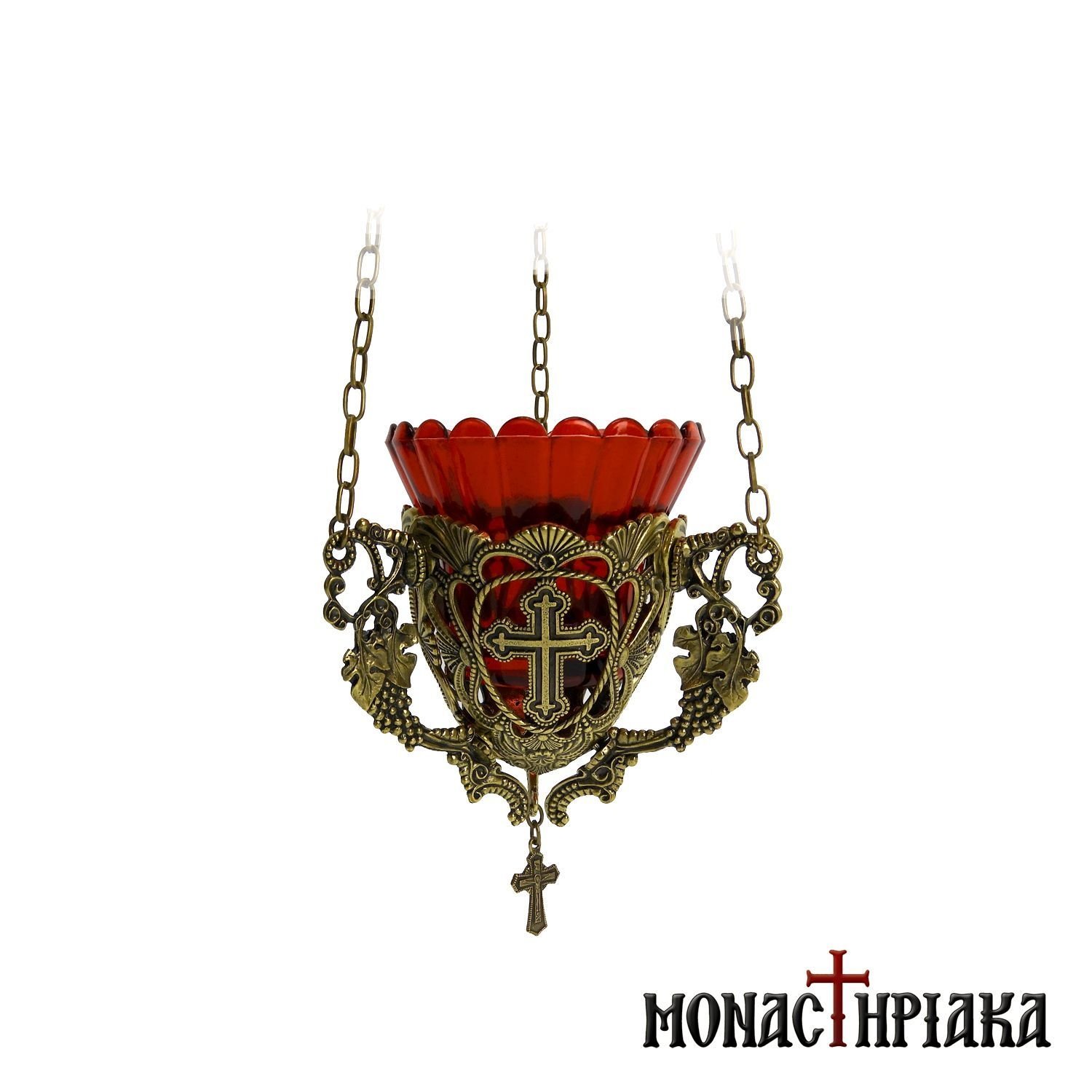 Metal hanging vigil lamp with outstandingly detailed representations. The three chains create angels in the ending, while in the body they form respectively three Byzantine crosses and a fourth in the bottom. It is a copy of an old monastery oil lamp and comes with rack, which has a similar form of vine, to hang on the wall. It is produced in three elegant versions: patina silver, patina gold and bright gold. In the last version (bright gold), the crosses are decorated with red enamel.