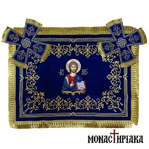 Holy Grail covers, embroidered in high quality satin fabric, with many details and rich Byzantine decoration, that is crafted by hand. The covers have a vivid blue color and at the center Jesus Christ is depicted.