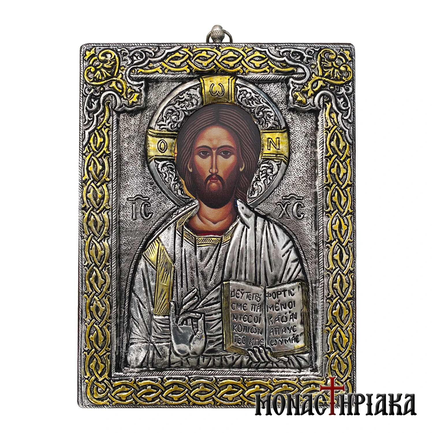 Silver icon with Jesus Christ blessing. Handmade silver icon on natural wood, made with 925ο silver with local 22K gold plating. The natural wood used for the synthesis of the icon is beech (fagus) from Mount Athos, a wood that is receptive to aging techniques that give the appearance of vintage to the wood, without altering the depicted image.