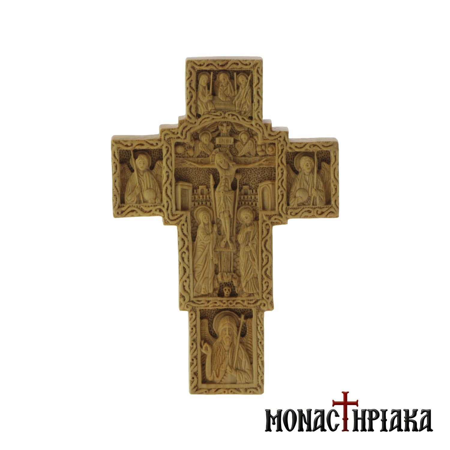 Multi-personal, handmade, wood-carved cross in boxwood, made by the monks in the Holy Scete of Saint Demetrios on Mount Athos. In the center of the cross, as a central theme, is presented the Crucifixion of the Lord, with Virgin Mary and the beloved disciple of Jesus, John, at the base of the Holy Cross. At the top, we can see the Hospitality of Abraham and the presence of the Holy Trinity. At the bottom, saint John the Forerunner is depicted. On the right and left sides, the Archangels Michael and Gabriel are presented.