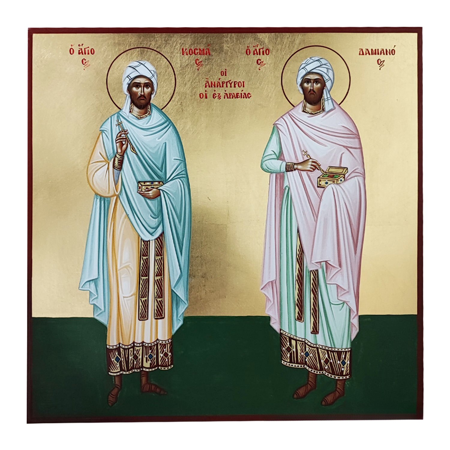 Hand painted icon of Saints Cosmas and Damian of Arabia, made in Mount Athos, on natural wood. The icon is delivered in a wooden box.