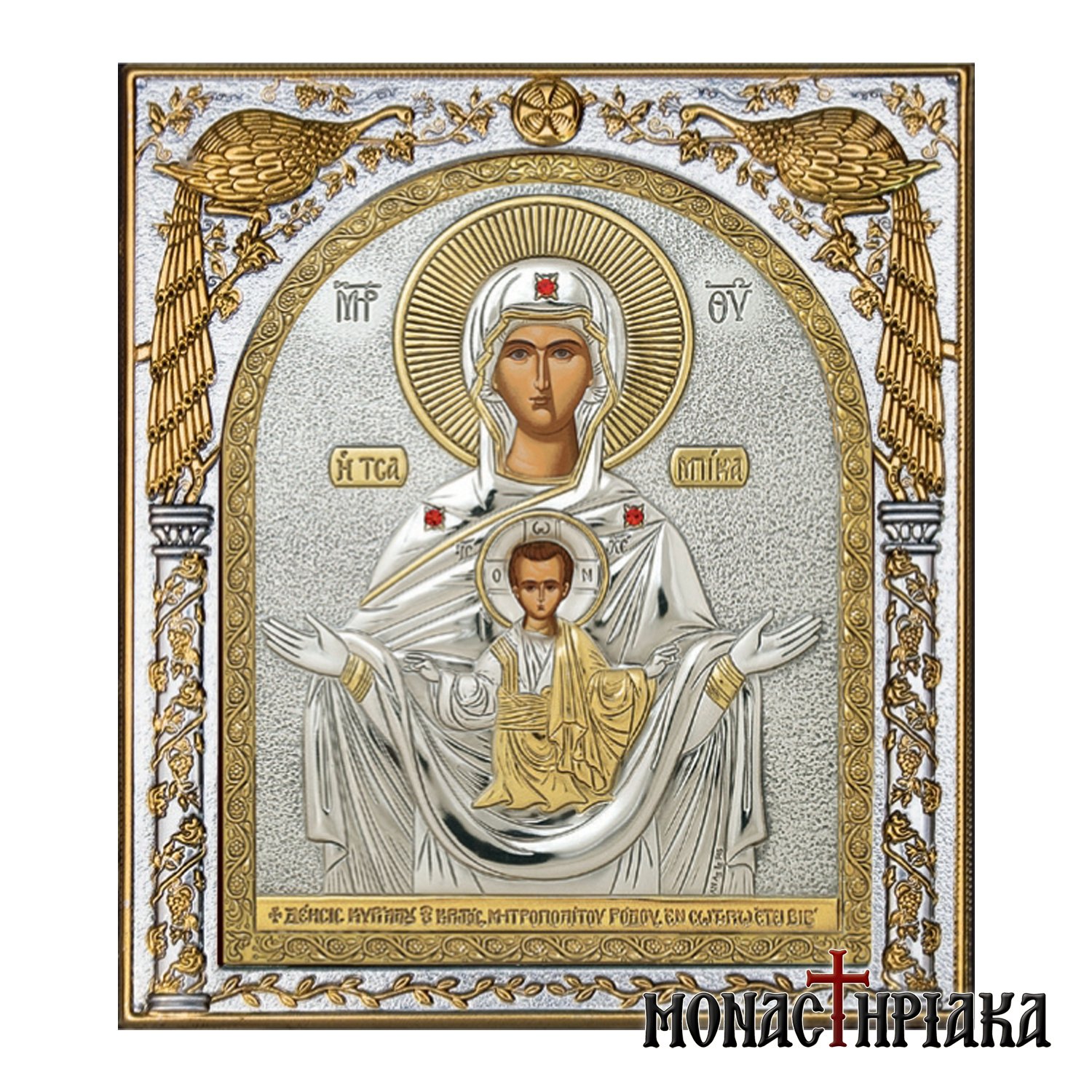 Silver-plated icon with Panagia Tsampika. The theme of the Christian icon is depicted with great clarity and rich detail, while impressive, embossed, Byzantine designs cover the entire surface of the icon. The material of the icon is composed of a special, durable metal alloy, impregnated with pure silver 999. The special treatment using the PVD method, as well as the excellent quality silkscreen printing according to the standards of Byzantine iconography, create the final result of the image that remains unchanged over time. The icons of this series can be hung on the wall and stand on a flat surface.