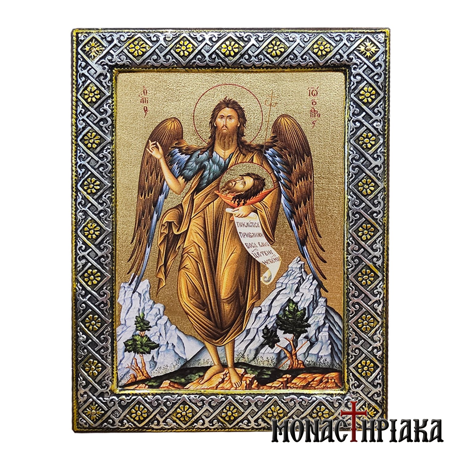 Silver icon with Saint John the Baptist. Handmade silver icon on natural wood, made with 925ο silver with local 22K gold plating. The natural wood used for the synthesis of the icon is beech (fagus) from Mount Athos, a wood that is receptive to aging techniques that give the appearance of vintage to the wood, without altering the depicted image.