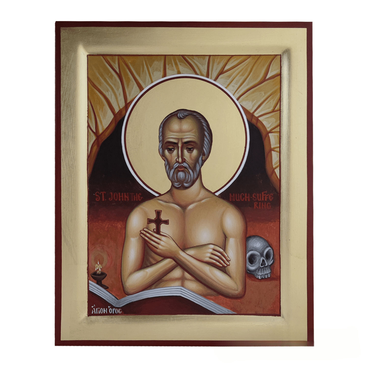 Handmade Byzantine iconography of the Saint John the Much-Suffering, made on Mount Athos, on natural wood. The icon is delivered in a wooden box.
