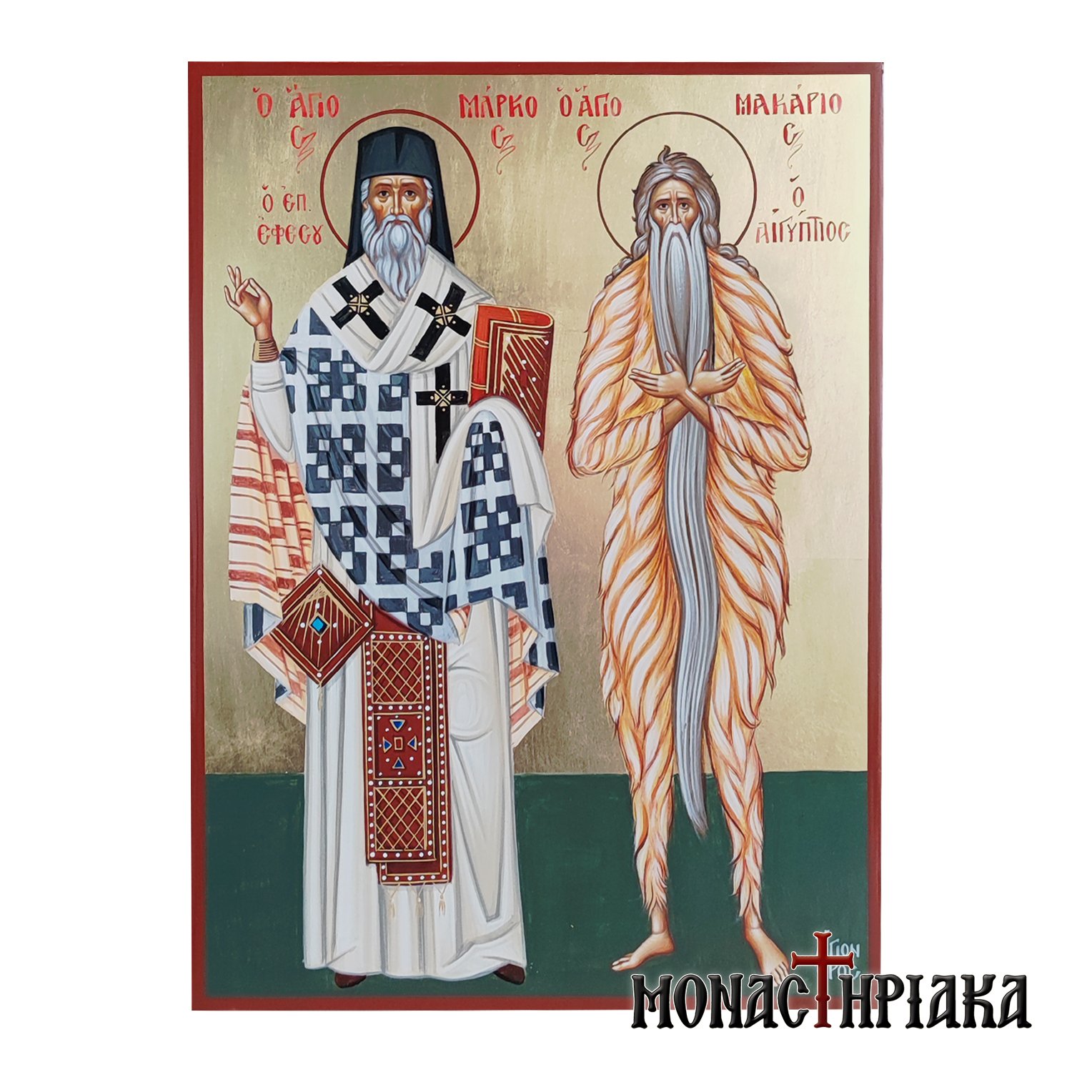Hand painted icon of Saint Mark the Courteous and Saint Makarius of Egypt made on Mount Athos, on natural wood. The icon is delivered in a wooden box.
