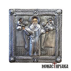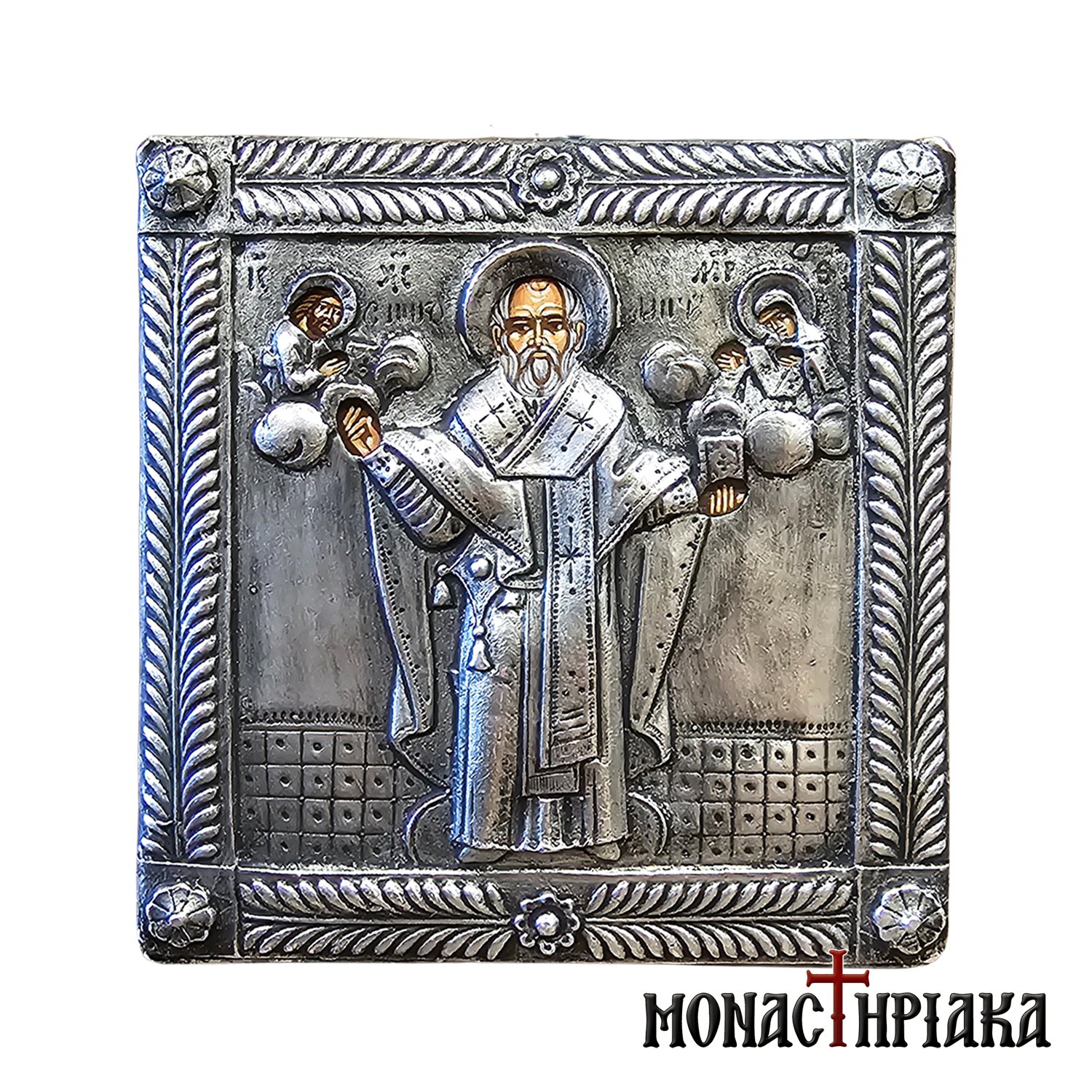 Silver icon with Saint Nicholas. Handmade silver icon on natural wood, made with 925ο silver. The natural wood used for the synthesis of the icon is beech (fagus) from Mount Athos, a wood that is receptive to aging techniques that give the appearance of vintage to the wood, without altering the depicted image.