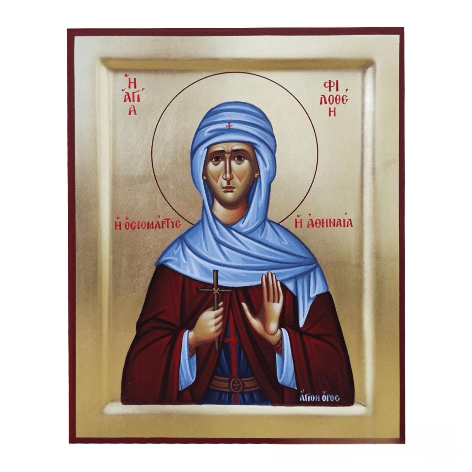 Hand painted icon of Saint Philothei, made in Mount Athos, on natural wood. The icon is delivered in a wooden box.