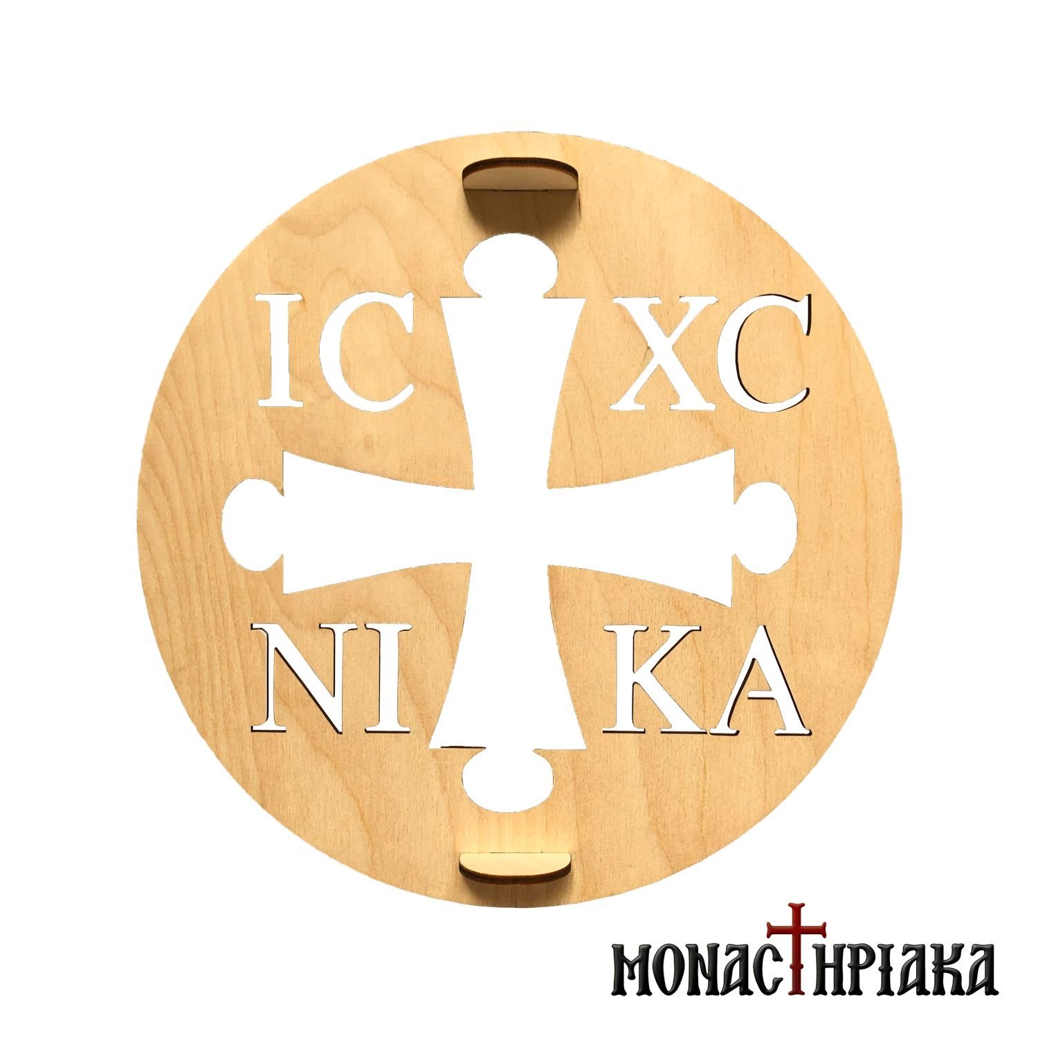 Wooden seal, stencil, for the decoration of the Koliva. The seal depicts a big Cross in the center and the symbol IC XC NIKA. It also has two handles for easier installation and removal.