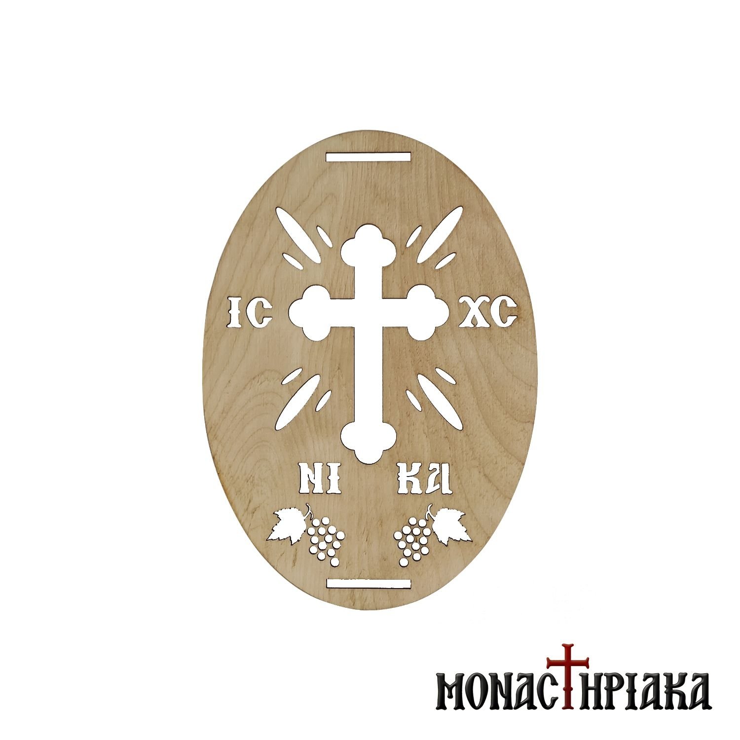 Wooden seal, stencil, for the decoration of the Koliva, in oval shape. The seal depicts a big Cross in the center and the symbol IC XC NIKA.