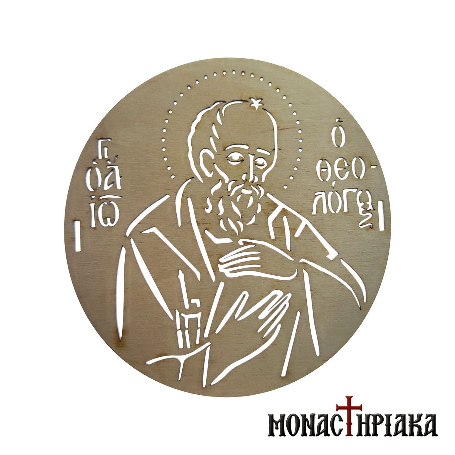 Wooden seal, stencil, for the decoration of the Koliva. The seal depicts the shape of Saint John the Theologian and has two handles for easier installation and removal.