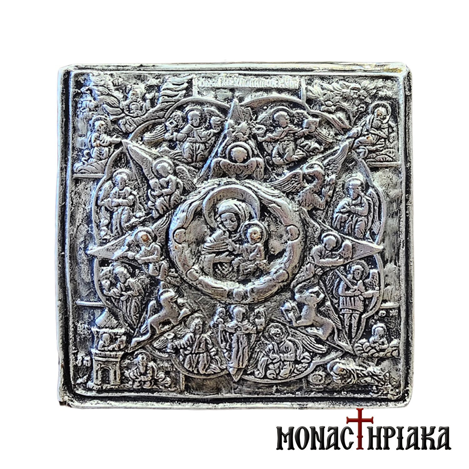 Silver icon with The Miracle of the Burning and Unburnt Bush. Handmade silver icon on natural wood, made with 925ο silver. The natural wood used for the synthesis of the icon is beech (fagus) from Mount Athos, a wood that is receptive to aging techniques that give the appearance of vintage to the wood, without altering the depicted image.