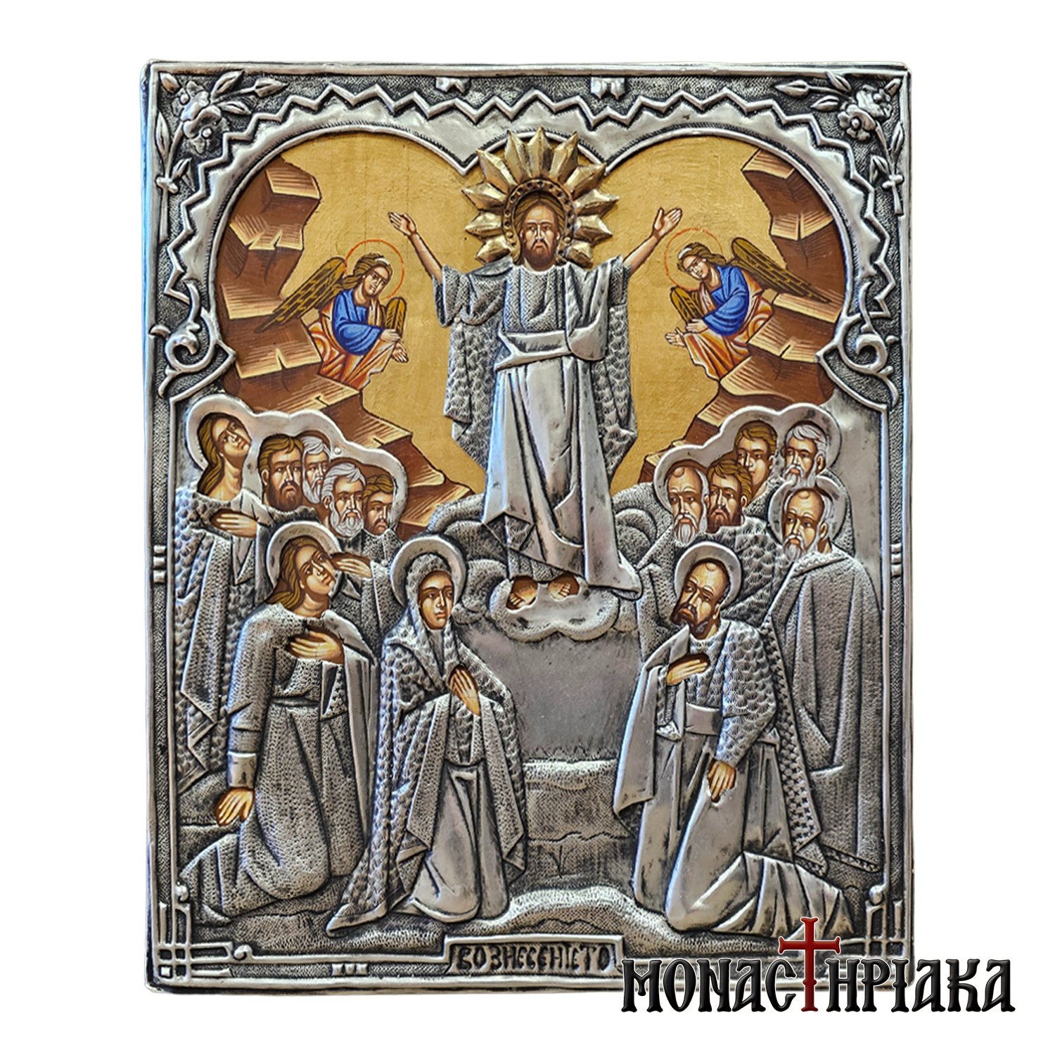 The depictions of faces, hands, halos or other representations are hand-painted on canvas by specialized iconographers, according to the traditional techniques of Byzantine Iconography. The silver frame of the icon is held by nails to resemble the original icons. On the back side, the icon has a small metal ring made of horseshoe nails so that it can be hung.