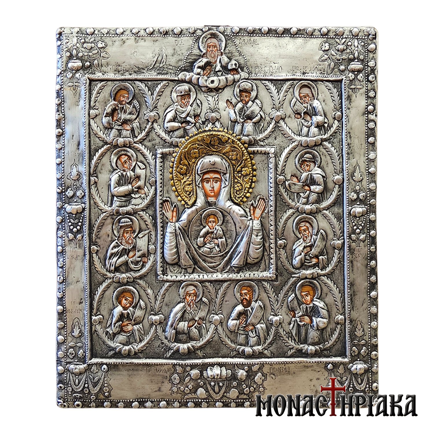 Silver icon with the Virgin Mary of Blachernae and the Twelve Apostoles. Handmade silver icon on natural wood, made with 925ο silver. The natural wood used for the synthesis of the icon is beech (fagus) from Mount Athos, a wood that is receptive to aging techniques that give the appearance of vintage to the wood, without altering the depicted image.
