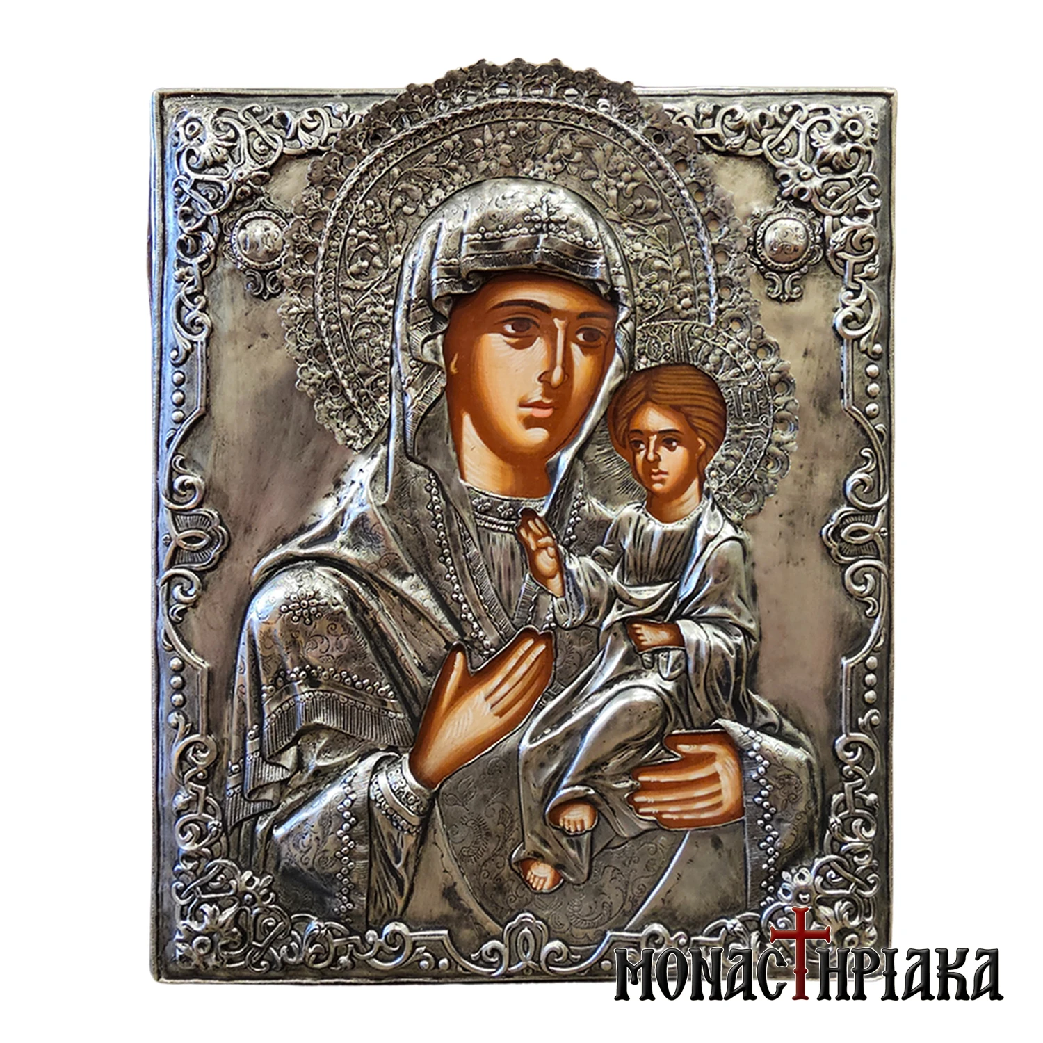 Silver icon with Virgin Mary Hodegetria. Handmade silver icon on natural wood, made with 925ο silver. The natural wood used for the synthesis of the icon is beech (fagus) from Mount Athos, a wood that is receptive to aging techniques that give the appearance of vintage to the wood, without altering the depicted image.