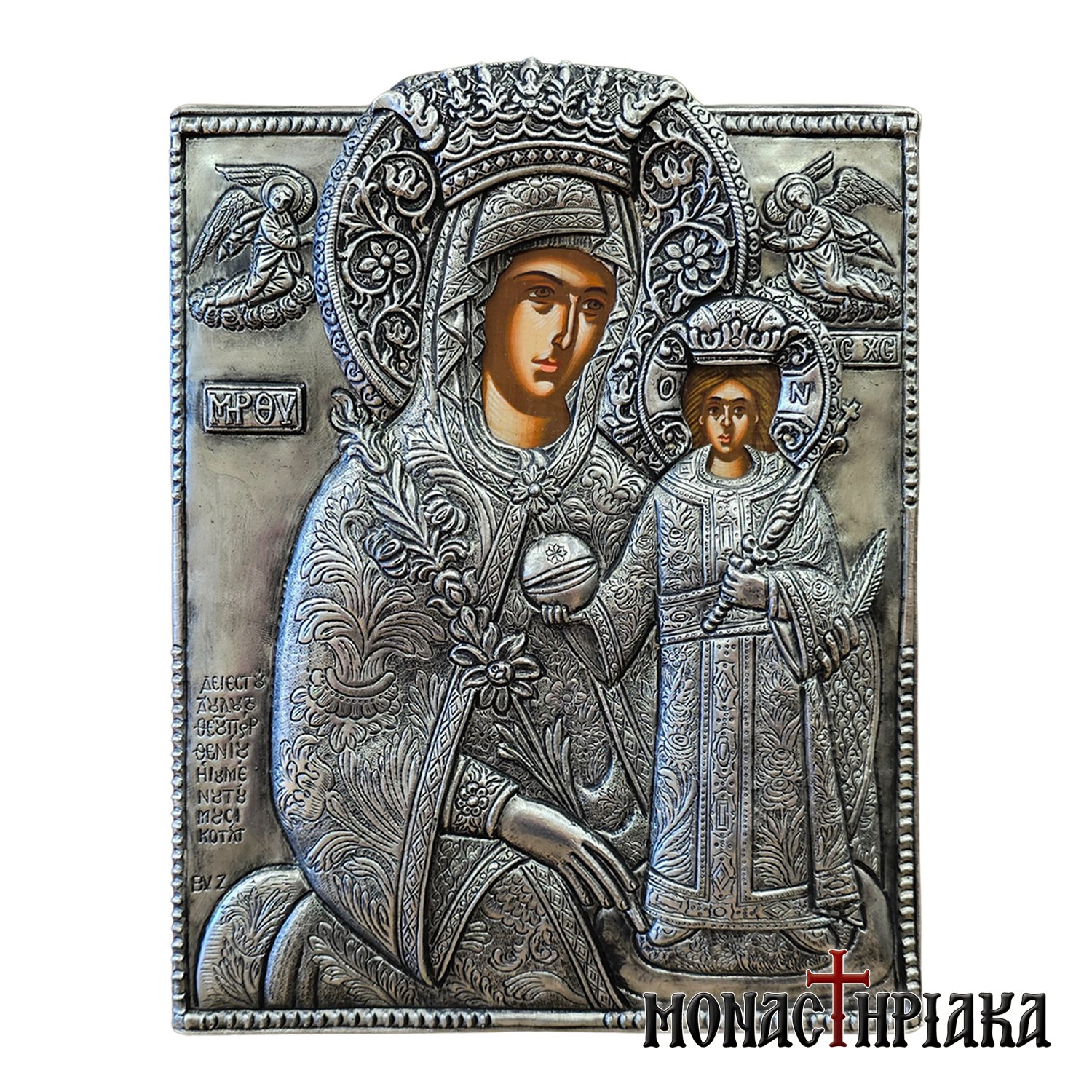 The depictions of faces, hands, halos or other representations are hand-painted on canvas by specialized iconographers, according to the traditional techniques of Byzantine Iconography. The silver frame of the icon is held by nails to resemble the original icons. On the back side, the icon has a small metal ring made of horseshoe nails so that it can be hung.