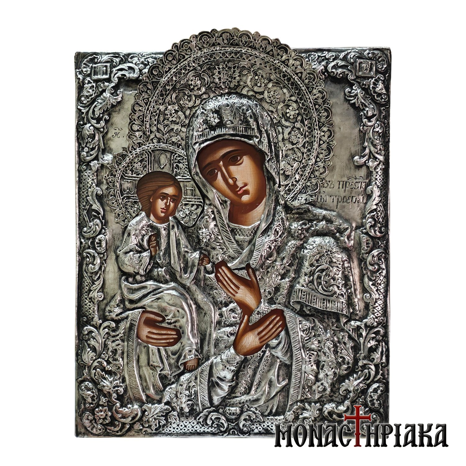 Silver icon with Virgin Mary Three-Handed Tricherousa. Handmade silver icon on natural wood, made with 925ο silver. The natural wood used for the synthesis of the icon is beech (fagus) from Mount Athos, a wood that is receptive to aging techniques that give the appearance of vintage to the wood, without altering the depicted image.