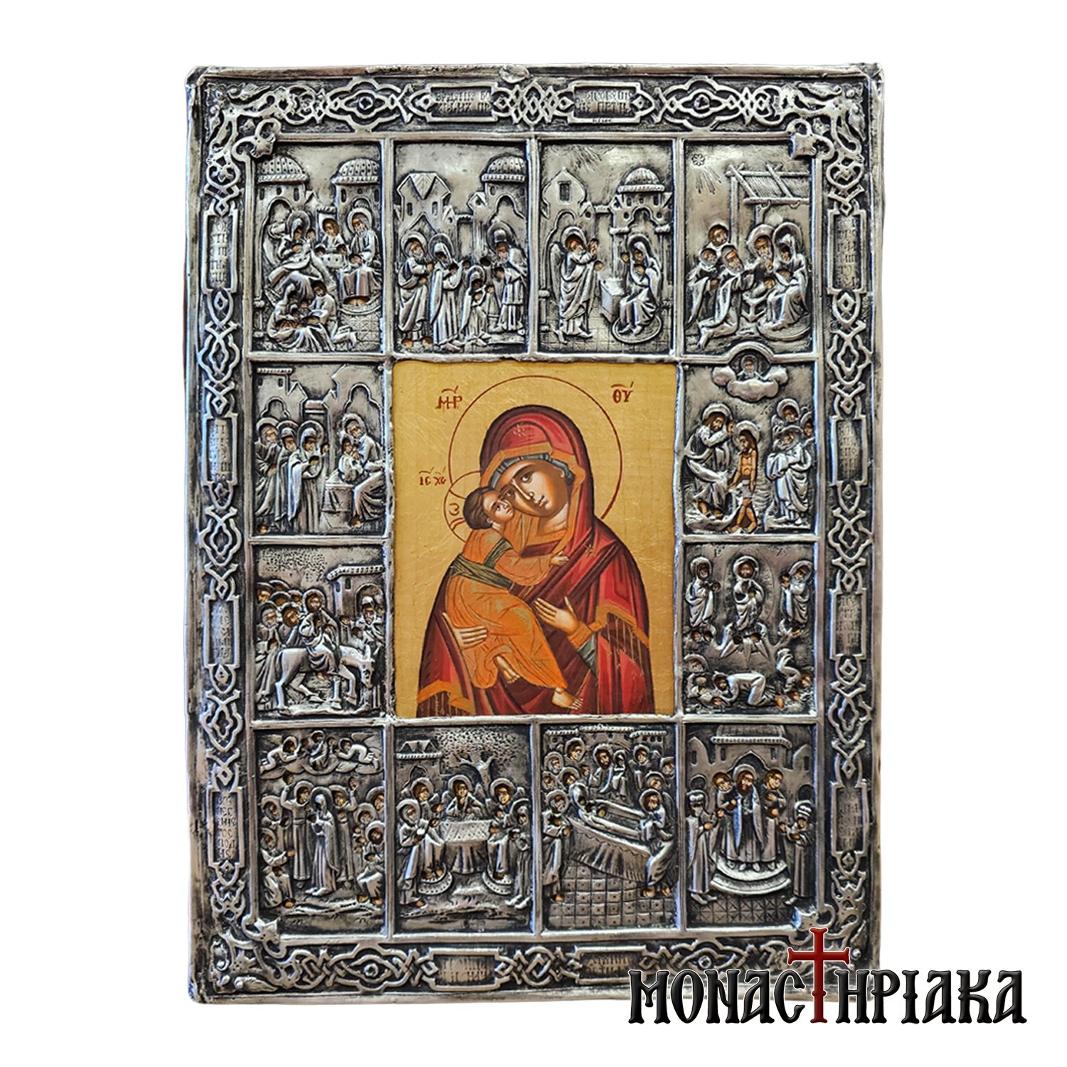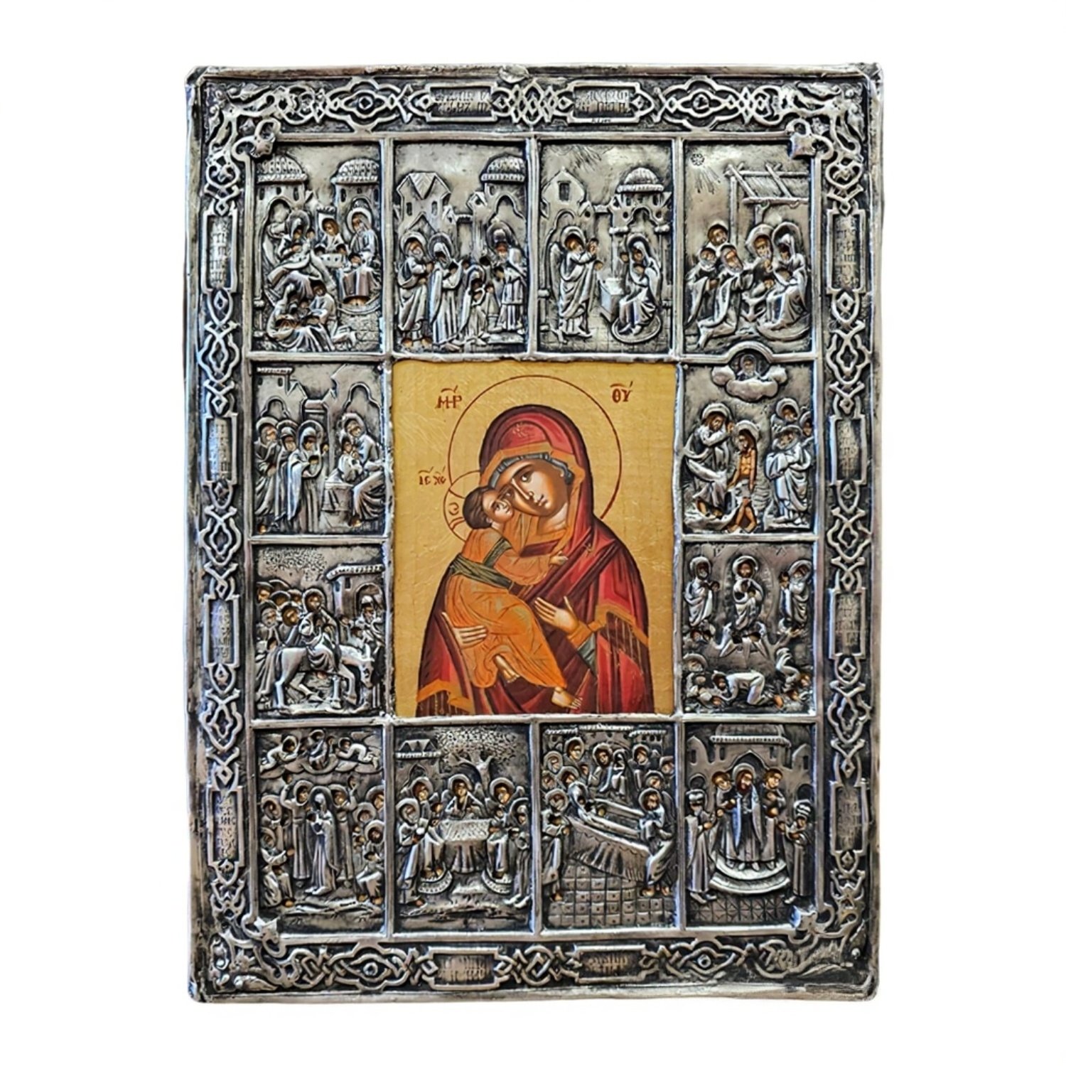 Multi-thematic silver icon with Theotokos Glykofilousa in the center and scenes from the life of the Virgin Mary and Jesus Christ. Starting from the top left corner, the Nativity of the Theotokos, the Presentation and Annunciation of the Virgin Mary, the Birth of Jesus and the Adoration of the Magi, the Presentation, the Baptism of Jesus Christ, the Entry into Jerusalem, the Transfiguration and Ascension of the Lord, the Dormition of the Theotokos and the Hospitality of Abraham are depicted in relief.