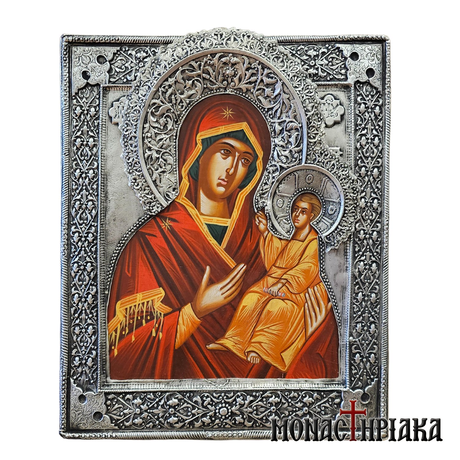 Silver icon with Virgin Mary Odigitria. Handmade silver icon on natural wood, made with 925ο silver. The natural wood used for the synthesis of the icon is beech (fagus) from Mount Athos, a wood that is receptive to aging techniques that give the appearance of vintage to the wood, without altering the depicted image.
