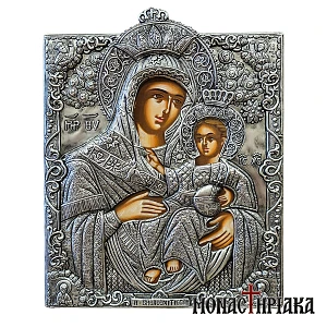 Silver icon with Theotokos of Bethlehem. Handmade silver icon on natural wood, made with 925ο silver. The natural wood used for the synthesis of the icon is beech (fagus) from Mount Athos, a wood that is receptive to aging techniques that give the appearance of vintage to the wood, without altering the depicted image.