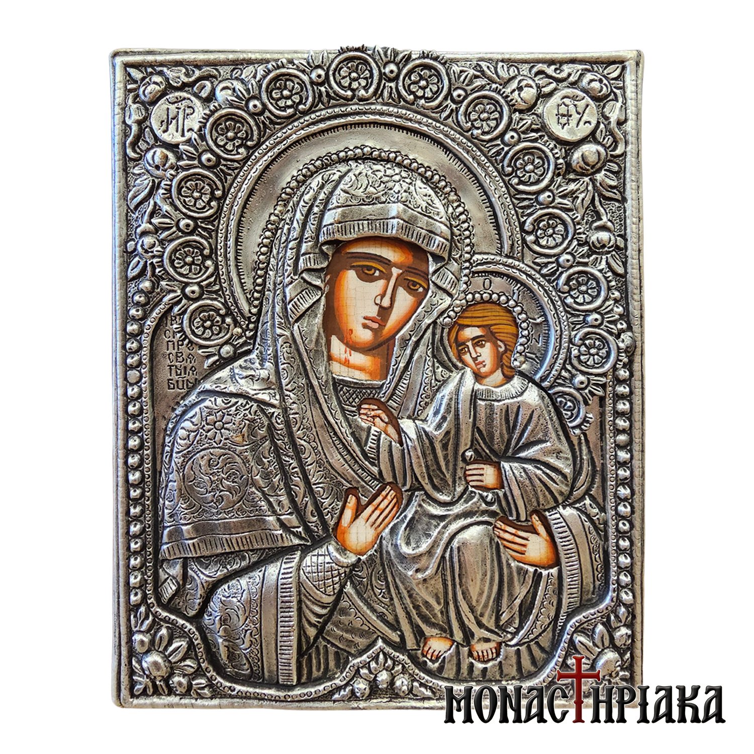 Silver icon with Theotokos Portaitissa. Handmade silver icon on natural wood, made with 925ο silver. The natural wood used for the synthesis of the icon is beech (fagus) from Mount Athos, a wood that is receptive to aging techniques that give the appearance of vintage to the wood, without altering the depicted image.