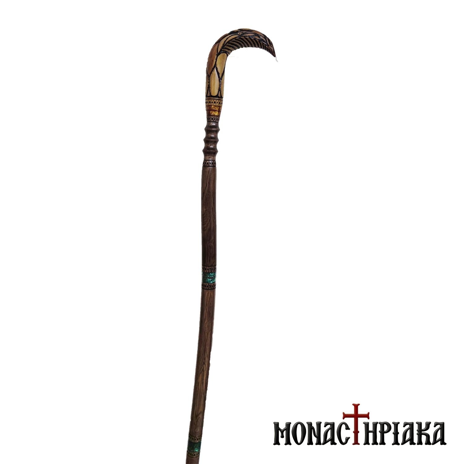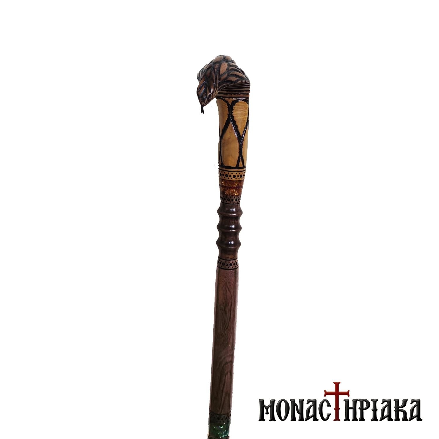 The wooden walking sticks or “vactiries’’, as the ancient greeks used to call them, are embedded in the life of the person, who is wandering, travelling on feet or lives and works in the nature. There are many representations and references of the canes in grave markers, in black-figure potteries and in the texts of Ancient Greek Literature. In Mount Athos, the walking sticks have always been beloved and useful protective tools for the monks. Here, where the time flows effortlessly, the monk has the ease to engrave on the cane motives, taken either from the religious globe, or from the natural (visible) world. Illustrations such as the Holy cross, Saint George, riders, birds, animals, human creatures or abstract designs used to be, and still are among the usual topics that the whittler monks choose. Plenty of raw material and in great quality are found easily in the virgin forests of Mount Athos; wild olive-trees, kermes, beech trees, dogwoods, linden tree and many more. Some canes are plain and others are more “heavy” or formal with special cravings, even despotic canes.