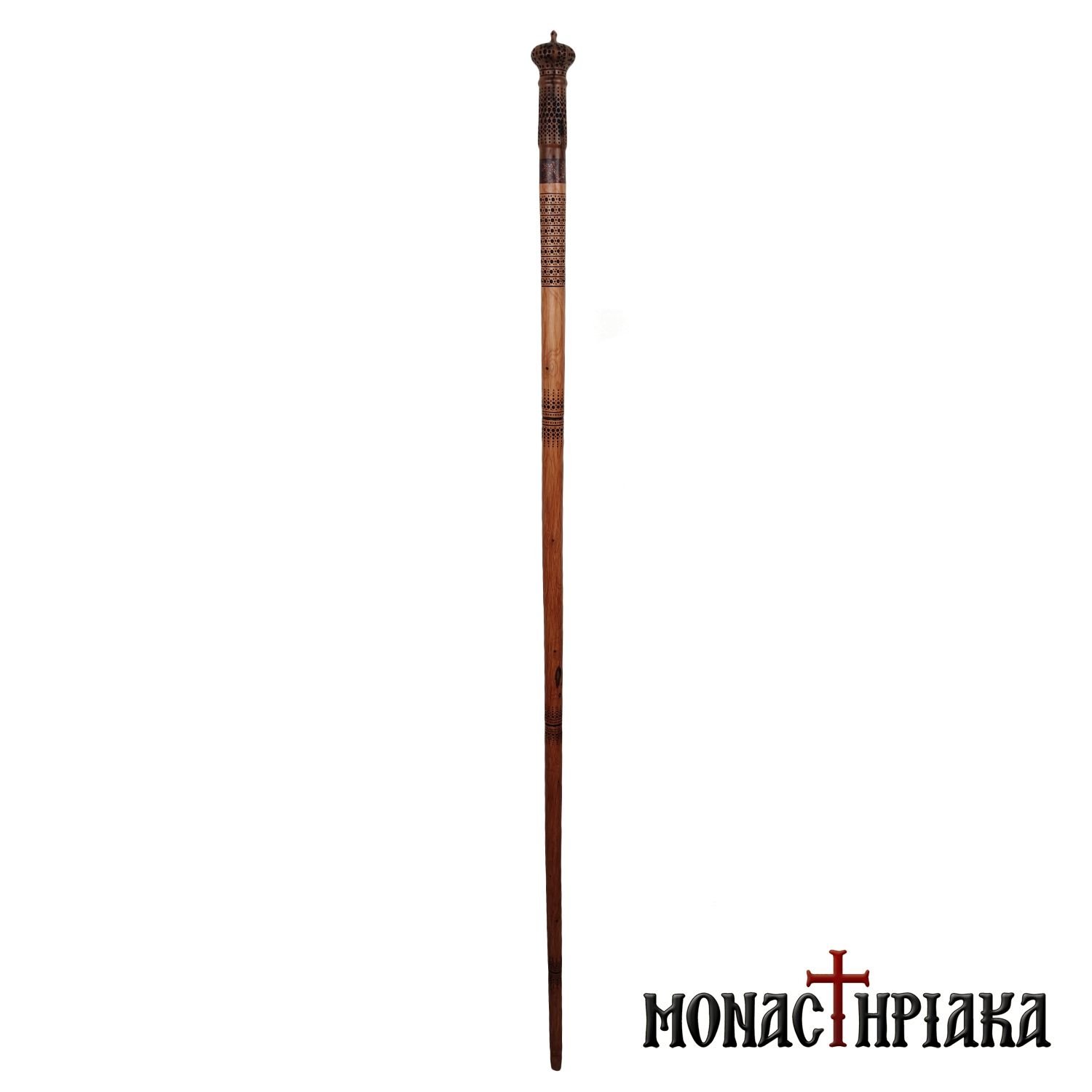 The wooden walking sticks or “vactiries’’, as the ancient greeks used to call them, are embedded in the life of the person, who is wandering, travelling on feet or lives and works in the nature. There are many representations and references of the canes in grave markers, in black-figure potteries and in the texts of Ancient Greek Literature. In Mount Athos, the walking sticks have always been beloved and useful protective tools for the monks. Here, where the time flows effortlessly, the monk has the ease to engrave on the cane motives, taken either from the religious globe, or from the natural (visible) world. Illustrations such as the Holy cross, Saint George, riders, birds, animals, human creatures or abstract designs used to be, and still are among the usual topics that the whittler monks choose. Plenty of raw material and in great quality are found easily in the virgin forests of Mount Athos; wild olive-trees, kermes, beech trees, dogwoods, linden tree and many more. Some canes are plain and others are more “heavy” or formal with special cravings, even despotic canes.