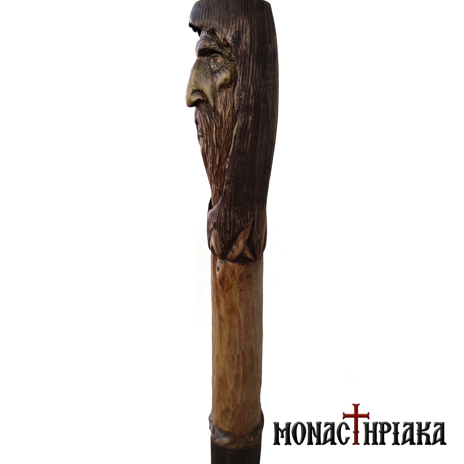 The wooden walking sticks or “vactiries’’, as the ancient greeks used to call them, are embedded in the life of the person, who is wandering, travelling on feet or lives and works in the nature. There are many representations and references of the canes in grave markers, in black-figure potteries and in the texts of Ancient Greek Literature. In Mount Athos, the walking sticks have always been beloved and useful protective tools for the monks. Here, where the time flows effortlessly, the monk has the ease to engrave on the cane motives, taken either from the religious globe, or from the natural (visible) world. Illustrations such as the Holy cross, Saint George, riders, birds, animals, human creatures or abstract designs used to be, and still are among the usual topics that the whittler monks choose. Plenty of raw material and in great quality are found easily in the virgin forests of Mount Athos; wild olive-trees, kermes, beech trees, dogwoods, linden tree and many more. Some canes are plain and others are more “heavy” or formal with special cravings, even despotic canes.