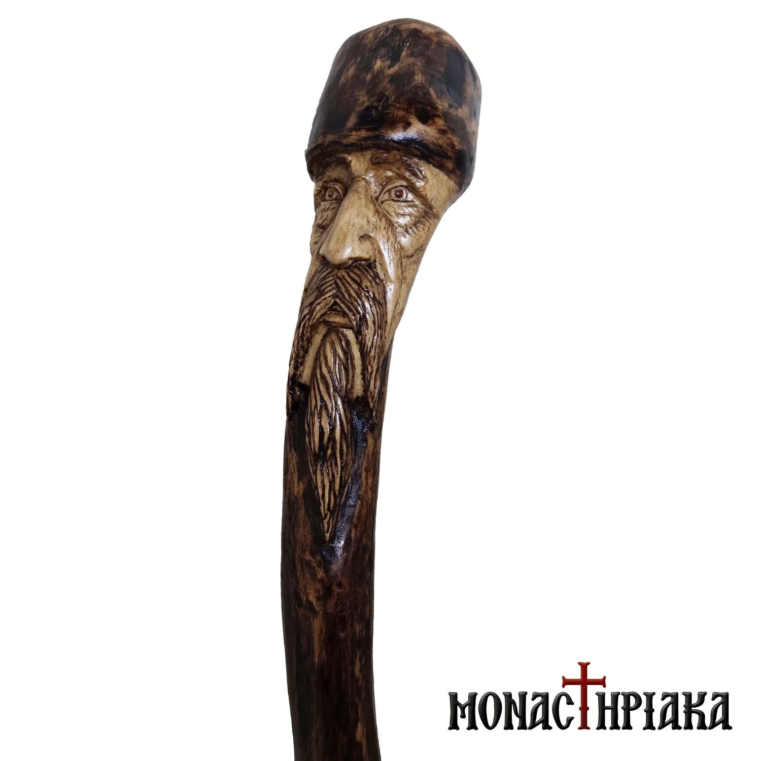 The wooden walking sticks or “vactiries’’, as the ancient greeks used to call them, are embedded in the life of the person, who is wandering, travelling on feet or lives and works in the nature. There are many representations and references of the canes in grave markers, in black-figure potteries and in the texts of Ancient Greek Literature. In Mount Athos, the walking sticks have always been beloved and useful protective tools for the monks. Here, where the time flows effortlessly, the monk has the ease to engrave on the cane motives, taken either from the religious globe, or from the natural (visible) world. Illustrations such as the Holy cross, Saint George, riders, birds, animals, human creatures or abstract designs used to be, and still are among the usual topics that the whittler monks choose. Plenty of raw material and in great quality are found easily in the virgin forests of Mount Athos; wild olive-trees, kermes, beech trees, dogwoods, linden tree and many more. Some canes are plain and others are more “heavy” or formal with special cravings, even despotic canes.