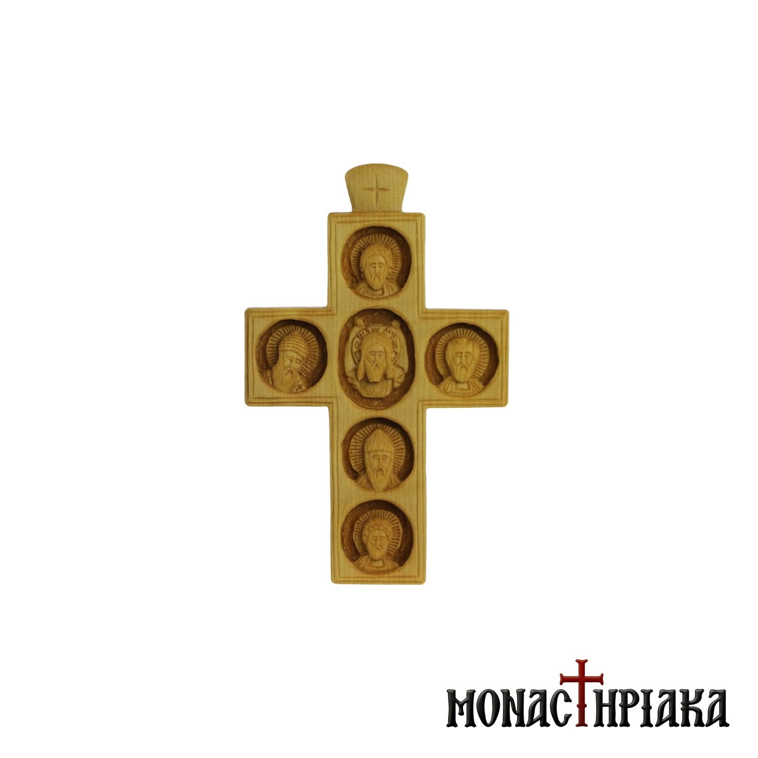 Wood Carved Cross with Holy Mandylion | Saint Paisios | Saint Nicholas | Saint Spyridon | Saint Minas