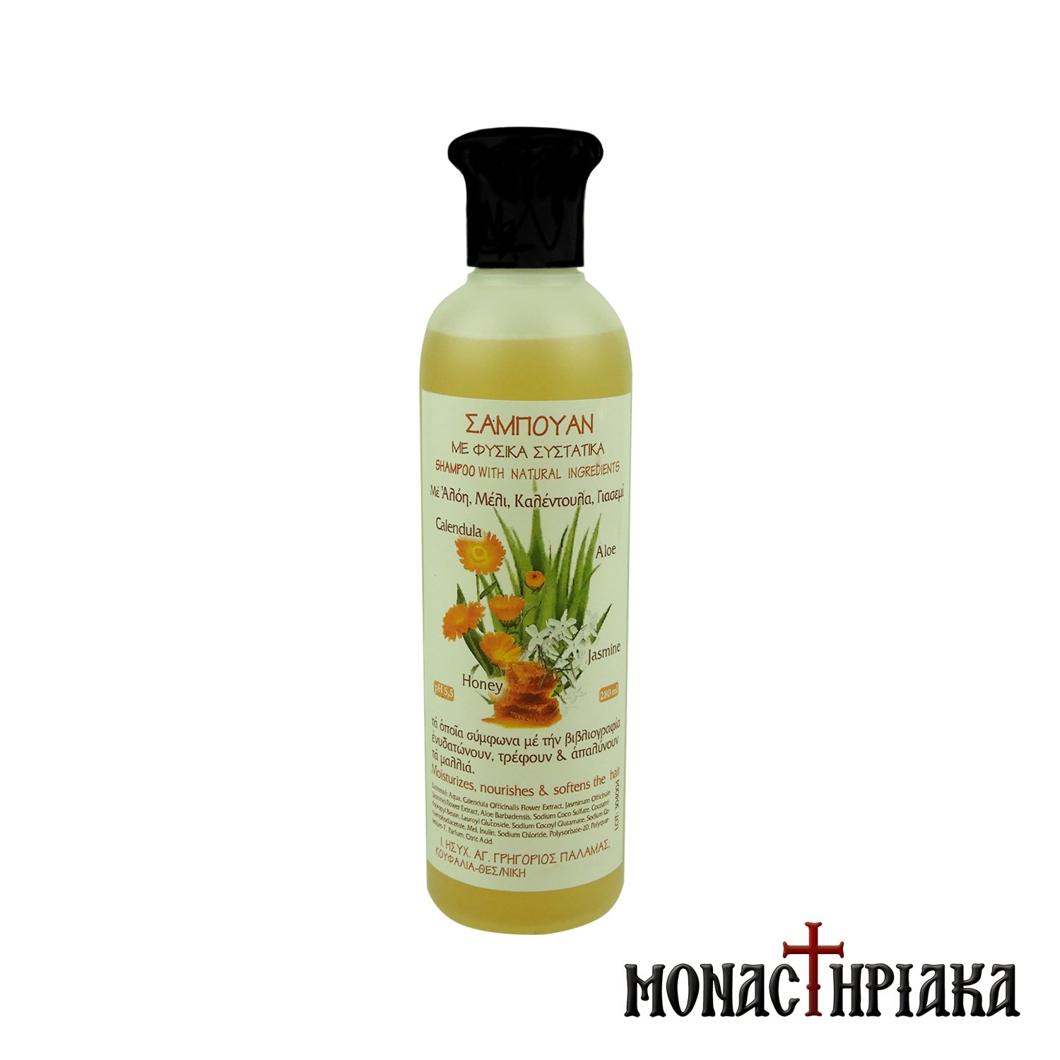 Φυσικό μοναστηριακό σαμπουάν με αλόη, μέλι, καλέντουλα και γιασεμί, από την αδελφότητα της Ιεράς Μονής Αγίου Γρηγορίου του Παλαμά. Το μοναδικό αυτό σαμπουάν, πλούσιο σε αιθέρια έλαια και αποστάγματα βοτάνων και φυτών, παρασκευάζεται χωρίς PARABENS (Free Parabens) και SLS (Free SLS). Ενυδατώνει, τρέφει και απαλύνει όλους τους τύπους μαλλιών, χωρίς ιδιαίτερο αφρισμό επειδή ακριβώς είναι φυσικό προϊόν.