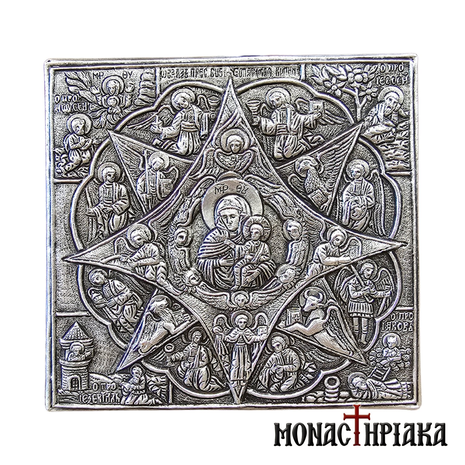 Ασημένια εικόνα με την Καιόμενη Βάτο. Χειροποίητη ασημένια εικόνα πάνω σε φυσικό ξύλο, κατασκευασμένη με ασήμι 925ο. Το φυσικό ξύλο που χρησιμοποιείται για τη σύνθεση της εικόνας είναι οξιά από το Άγιον Όρος, ένα ξύλο που επιδέχεται τεχνικές παλαίωσης που προσδίδουν την αίσθηση του χρόνου, χωρίς να αλλοιώνεται η παράσταση που απεικονίζεται.