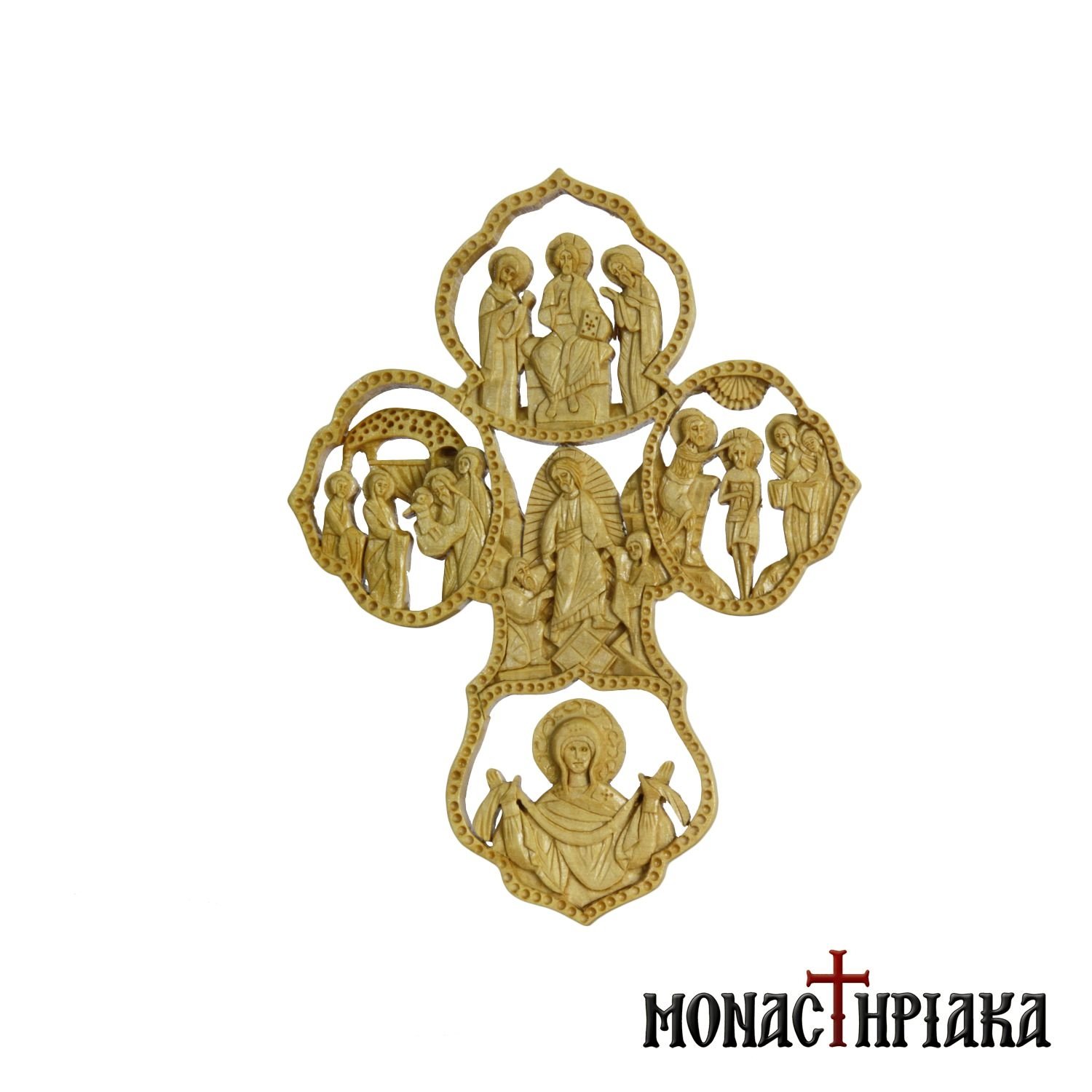 Ξυλόγλυπτος Πολυπρόσωπος Σταυρός με Παραστάσεις με την Παναγία & τον Κύριο